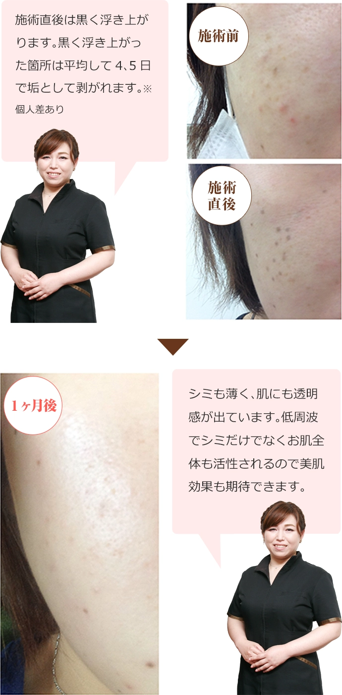 同じシミの箇所に一ヶ月間隔でアプローチし、ターンオーバーを促し徐々にシミを薄く改善していきます。一度の施術でシミが無くなるわけではございませんのでご注意ください。